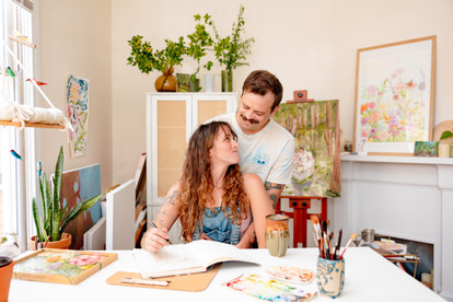 What makes Amanda’s work so special is the heart she pours into it. Her love for nature and storytelling shines through in every brushstroke, inspired by her time in Kona and her life now in Wilmington. She’s not just an artist; she’s a storyteller who captures the essence of love, joy, and connection. Her husband Elliot, their rescue pup Stevie, and their quirky cat Larrie are her biggest cheerleaders, grounding her in a life filled with love and creativity.